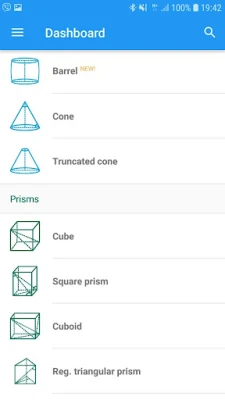 - PRO version: square pyramid, triangular pyramid, triangular prism, regular triangular prism, Thales' theorem, truncated cone, regular octagon, regular dodecagon, hexagonal prism, hexagonal pyramid, pentagonal prism, barrel, law of sines , law of cosines, spherical wedge, spherical lune, spherical segment, spherical zone