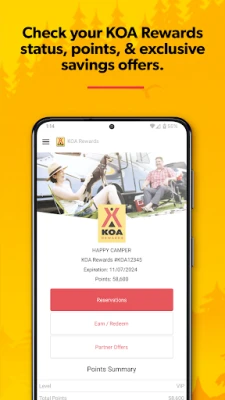 • Earn rewards: If you're a KOA Rewards camper, you can track your points, rewards, and more in the app.