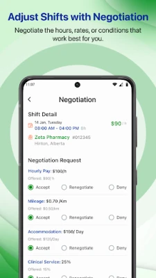 Apply & Negotiate: Apply to shifts with one tap and easily negotiate terms like pay, reimbursements, or timing with pharmacy operators.